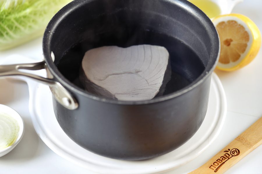 Вскипятите воду в сотейнике, слегка посолите, выложите в нее тунца. Спустя 40-50 секунд откиньте на сито, остудите.