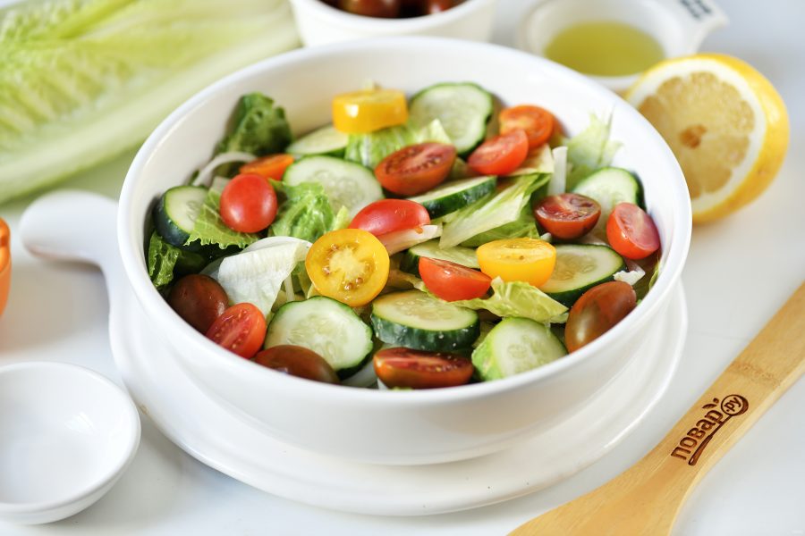 Посыпьте салат тонко нарезанным сладким луком, добавьте разрезанные пополам черри и нарезанный любым способом свежий огурец.