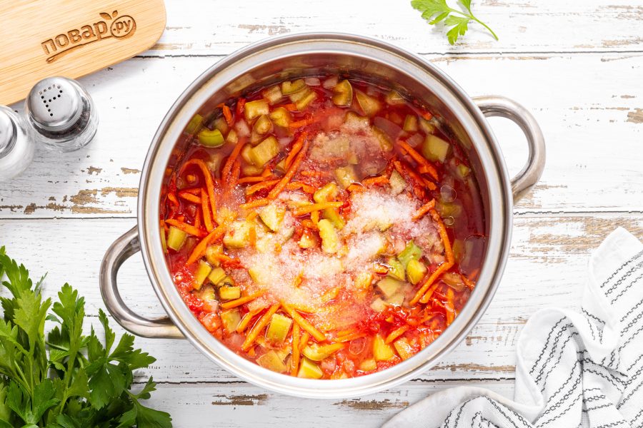 Перемешайте, доведите до кипения и варите на небольшом огне 40-45 минут до мягкости риса. В конце влейте уксус.
