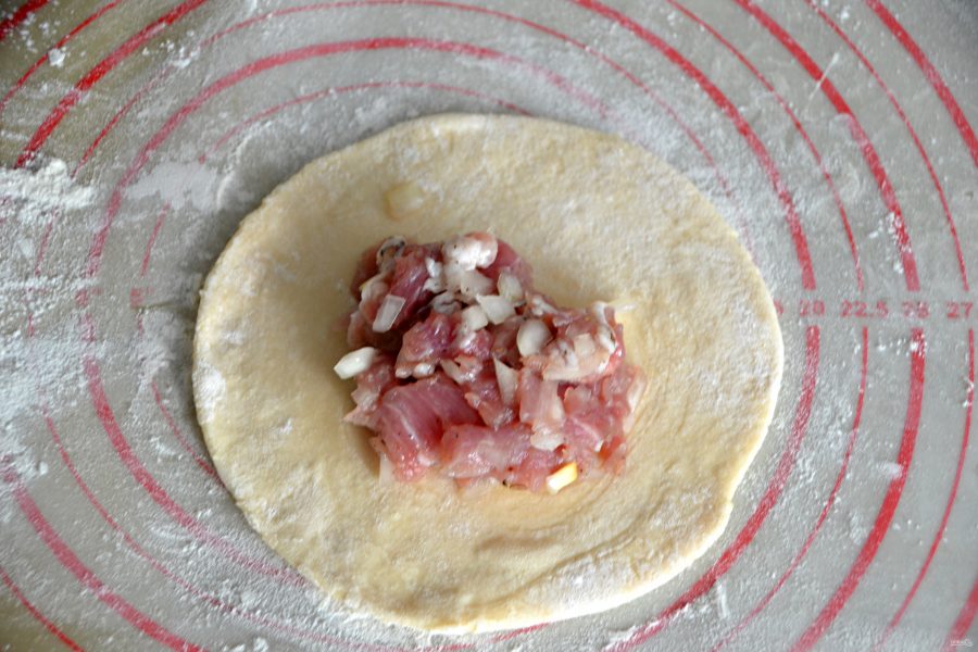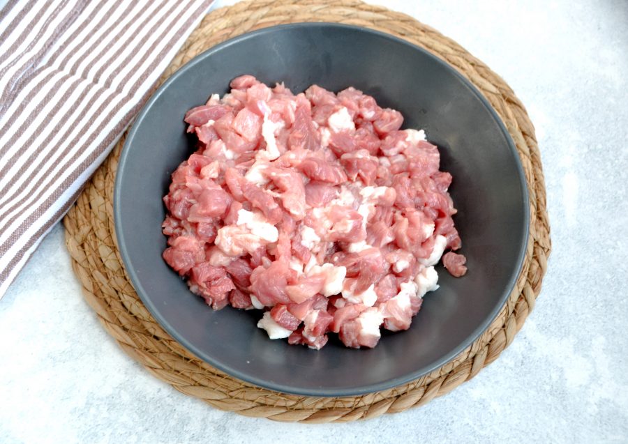 Пока тесто «отдыхает», займитесь приготовлением начинки. Нарежьте свинину на мелкие кусочки.