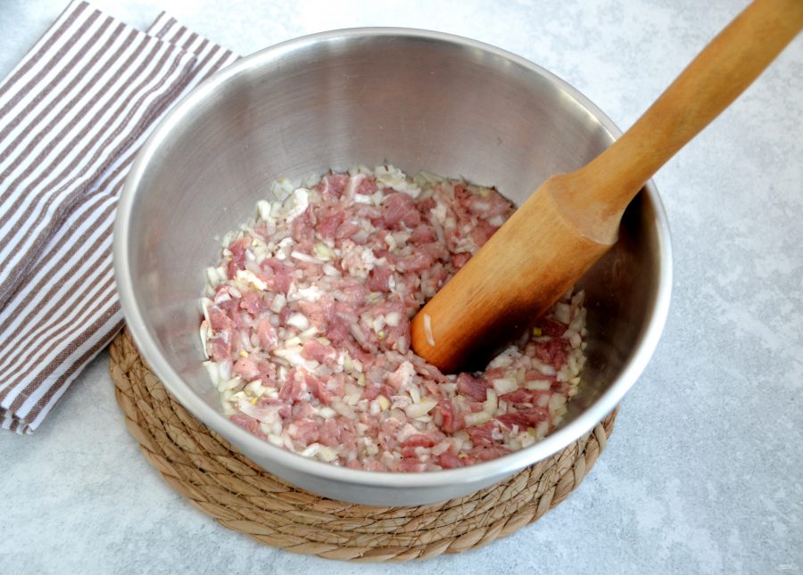 Хорошо отбейте начинку, чтобы лук отдал сок и все вкусы соединились. Можно использовать для этих целей деревянную толкушку.