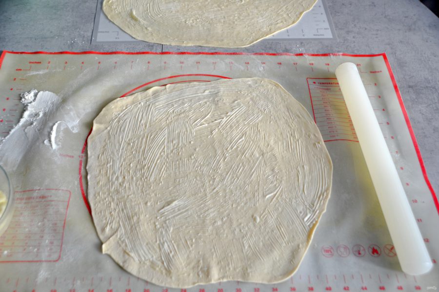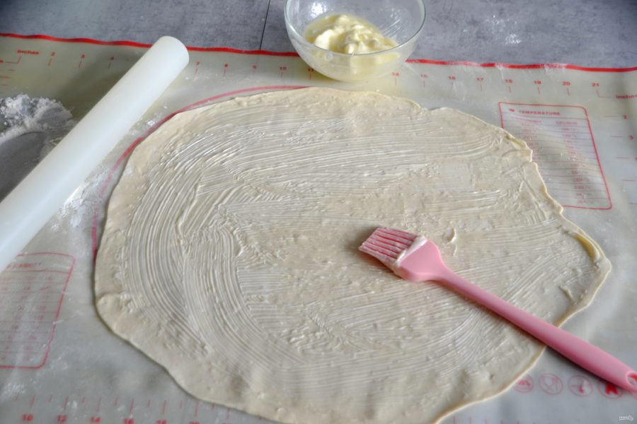 Раскатайте кусочек теста в большой и тонкий пласт. Подсыпайте стол мукой, если тесто начинает прилипать. Смажьте тесто размягченным сливочным маслом и отложите в сторону.