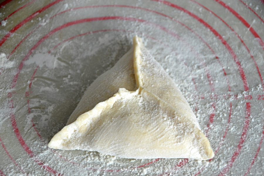 Сформируйте треугольный пирожок — самсу, тщательно защипните края, особенно центр, чтобы при выпекании не вытекал сок. Выложите на противень «швом» вниз.