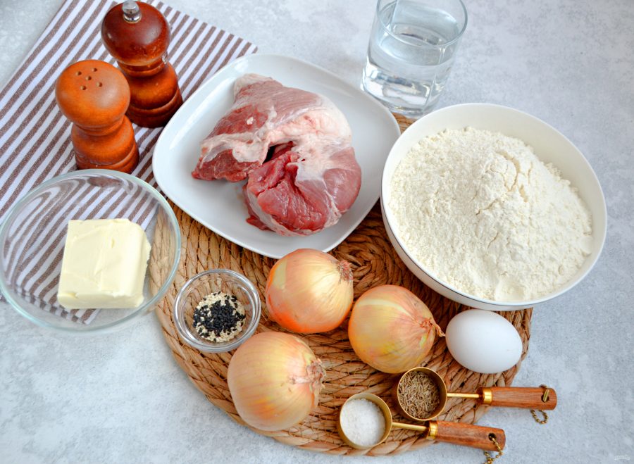 В миску выложите подготовленную свинину и лук, посолите и поперчите по вкусу. Добавьте зиру, прежде чем всыпать зиру в начинку, разотрите ее между ладоней.