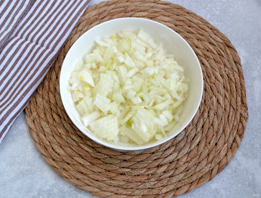 Мелко нарежьте лук. Нарезать можно полукольцами или кубиком, ровно так, как нравится.
