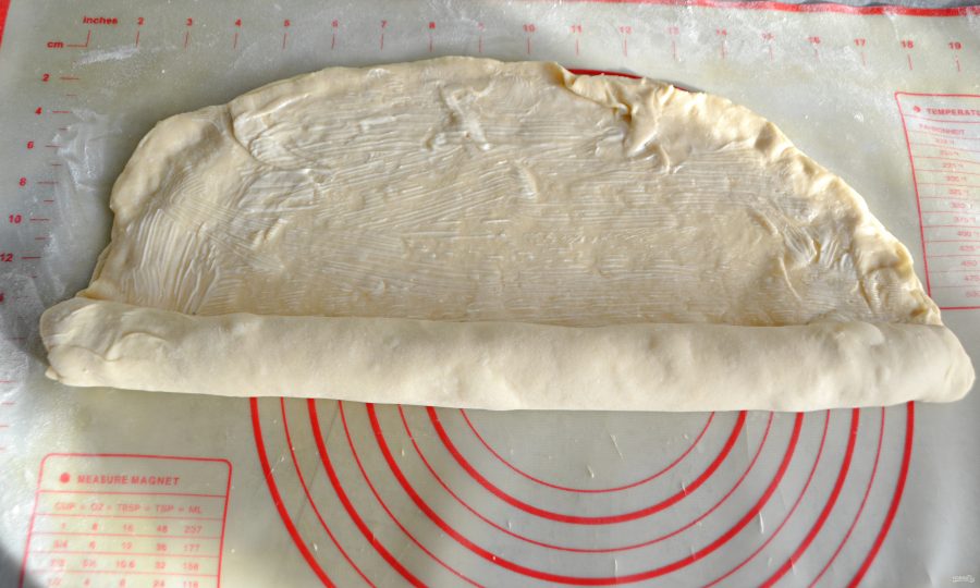 Сверните в тугой рулет вместе все четыре пласта теста, особенно аккуратно и плотно сворачивайте в самом начале по всей длине, чтобы при выпекании тесто на развалилось.