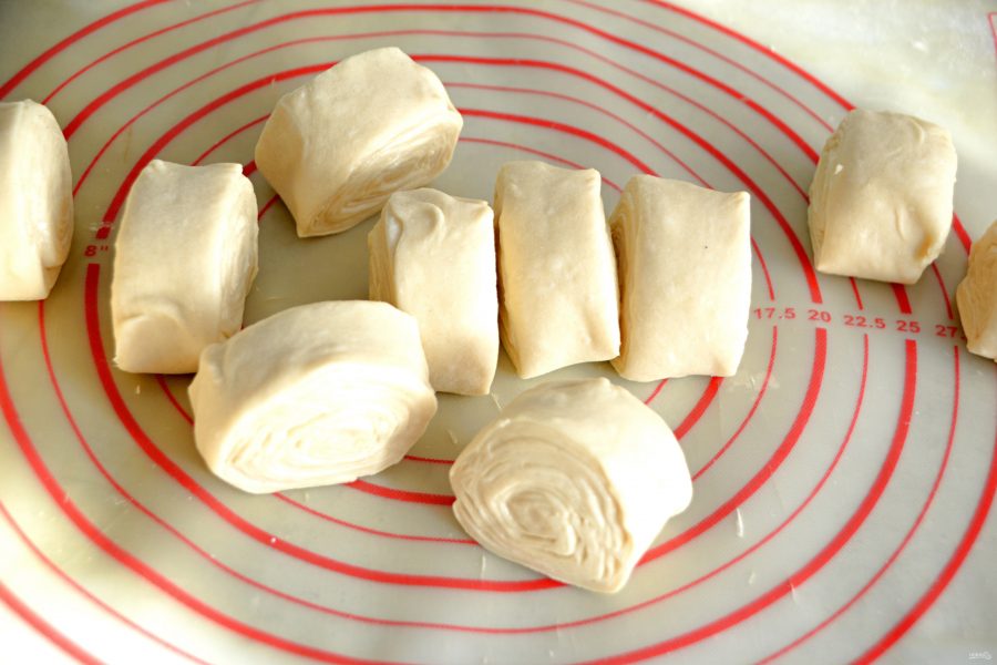 Нарежьте рулет из теста на 12 частей.