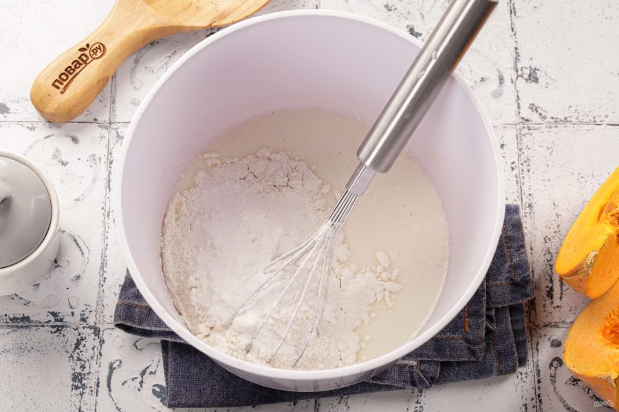 Тыкву очистите и нарежьте небольшими кубиками. Добавьте в миску к тесту.