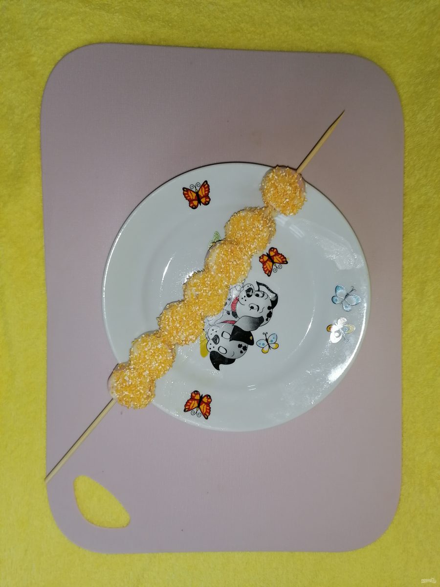 Обмакиваем сначала в кляр, потом макаем в поленту "Bravolli", чтобы было красиво и обжариваем на растительном масле в разогретой сковороде с двух сторон до румяной корочки. Сковороду надо взять большого диаметра, чтобы поместилась шпажка.