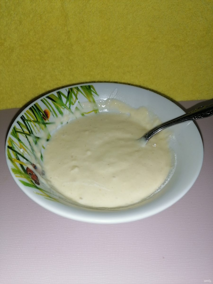 Готовим кляр. Смешиваем муку, яйцо, майонез, соль. Все перемешиваем до однородной массы. Если у вас майонез жидкий, то добавке муки, чтобы кляр получился густой. Можете добавить свои любимые приправы или натереть зубчик чеснока.