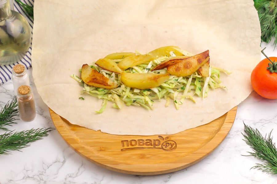 Разверните лаваш на доске или рабочей поверхности и на его край выложите капустный салат, а на него — жареный картофель.