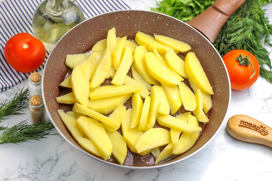 Нарежьте картофель ломтиками и обжарьте примерно 15-20 минут в 20-30 мл. растительного масла на сковороде, время от времени перемешивая.