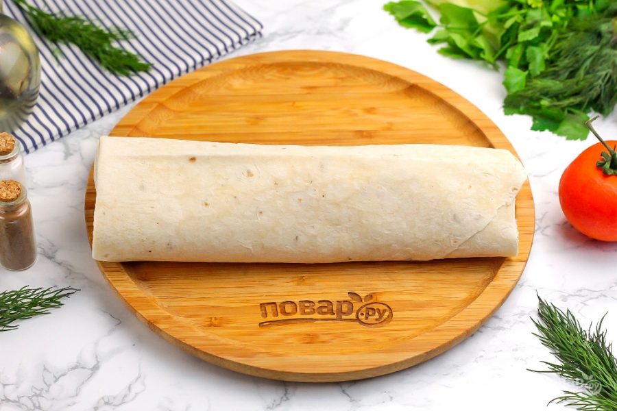 Аккуратно заверните боковые края внутрь и сверните все в виде рулета. Старайтесь прижимать начинку плотно, но не так, чтобы порвался сам лаваш.