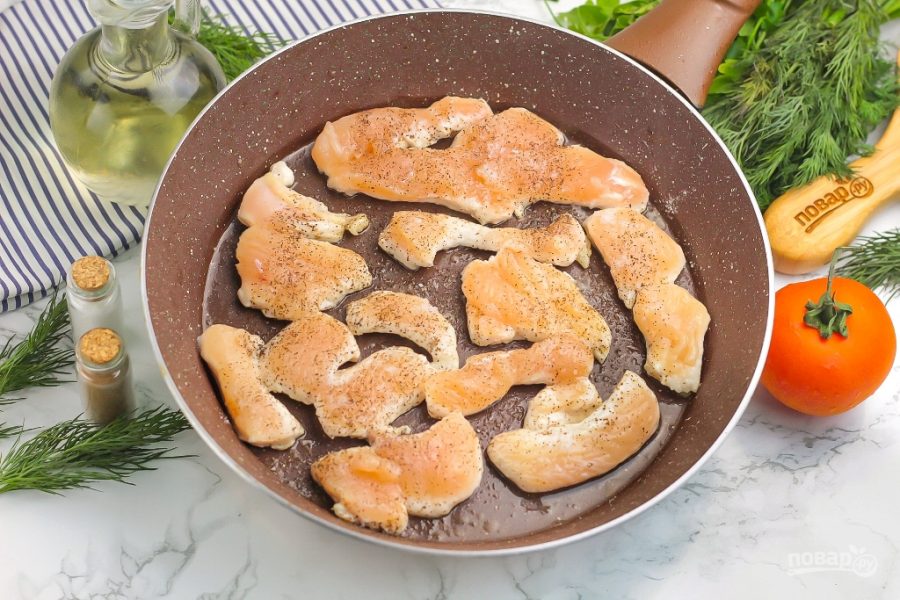 Разогрейте сковороду с растительным маслом. Куриное филе нарежьте ломтиками, но не слишком толстыми. Выложите на сковороду, посолите и поперчите, обжарьте с каждой стороны до румяности примерно 10-12 минут.