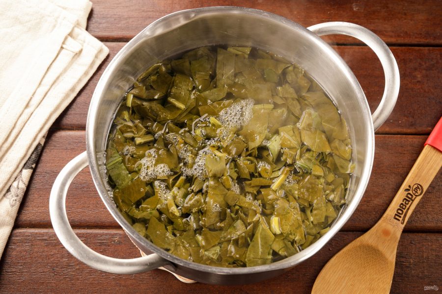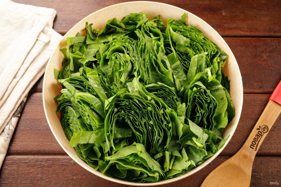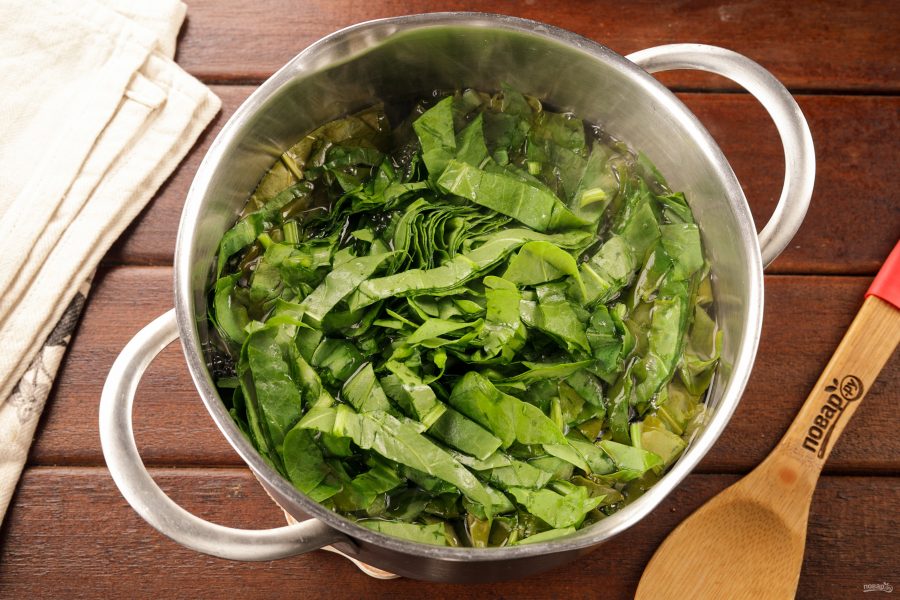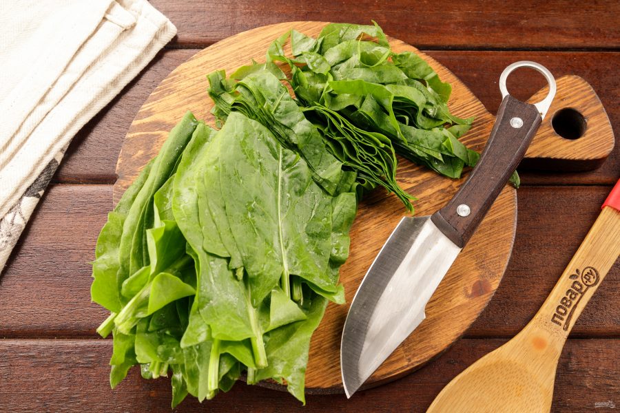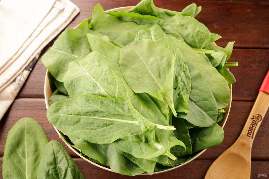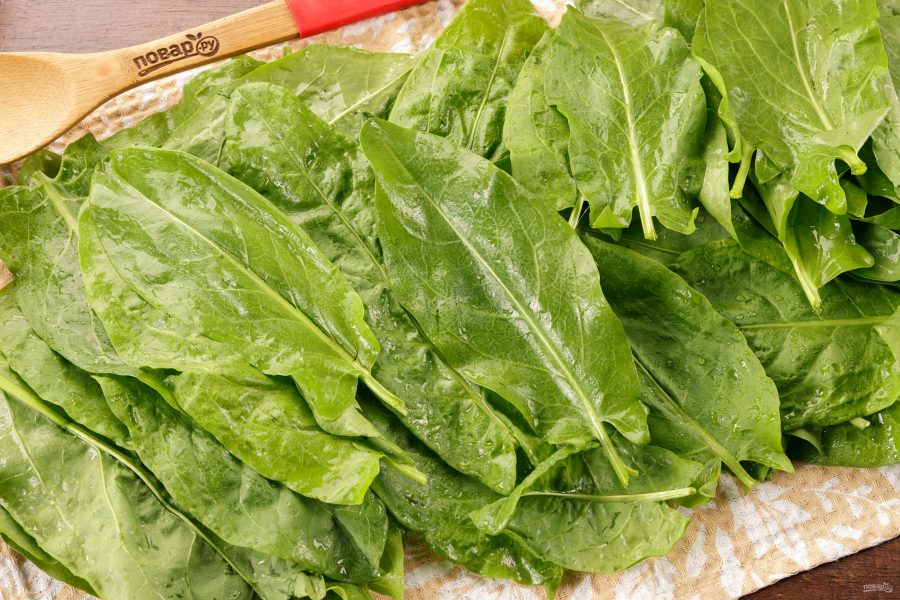 Щавель тщательно промойте в большом количестве воды. Для этого поместите его в широкую ёмкость и залейте водой, удаляя грубые черенки. Несколько раз смените воду.