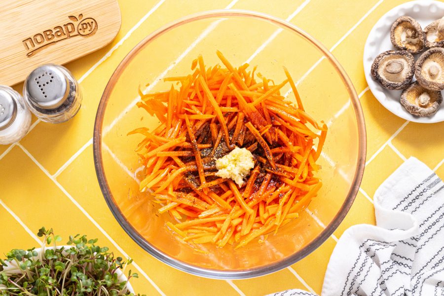Переложите морковь в глубокую миску, добавьте соль и сахар. Руками пожмите, чтобы морковь пустила сок.
