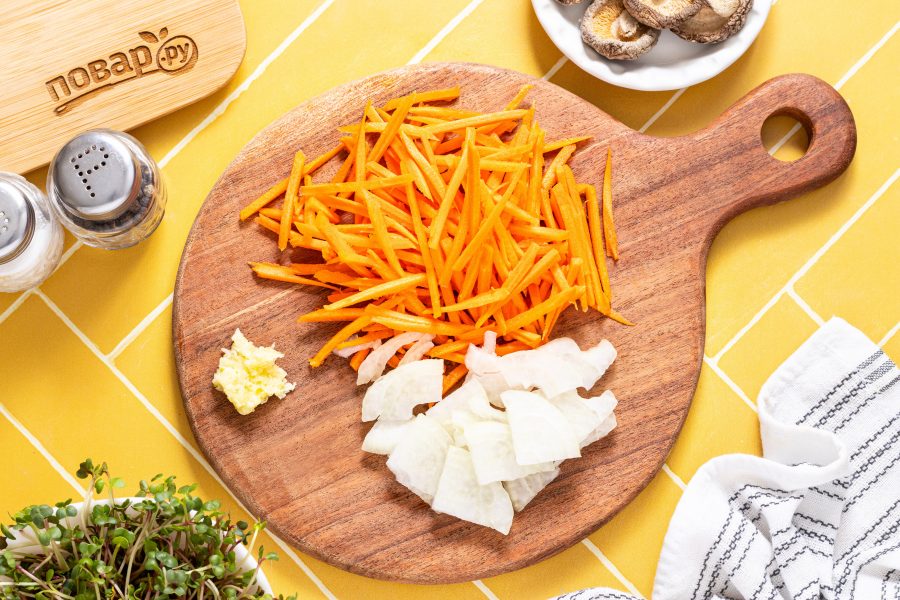 Репчатый лук нарежьте полукольцами, а морковь очистите и натрите на терке для моркови по-корейски. Чеснок очистите и пропустите через пресс.