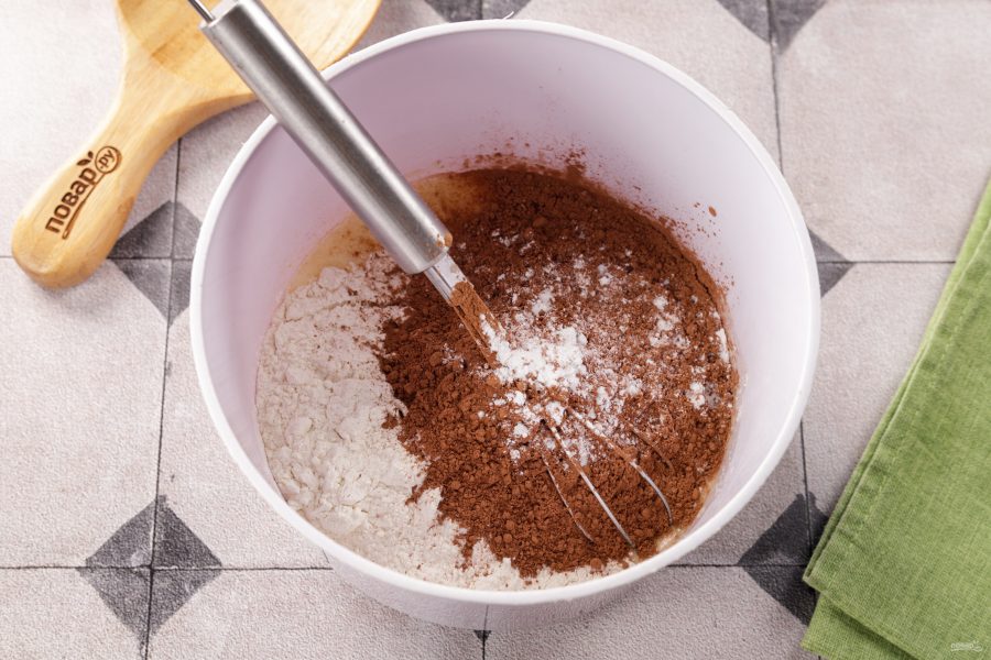 Снова перемешайте тщательно венчиком, чтобы блинное тесто стало однородным. Оставьте тесто для шоколадных блинчиков на столе на 15-20 минут, за это время все ингредиенты вступят в более «тесный контакт». Сковороду слегка смажьте растительным маслом, чтобы первый блин не получился комом.