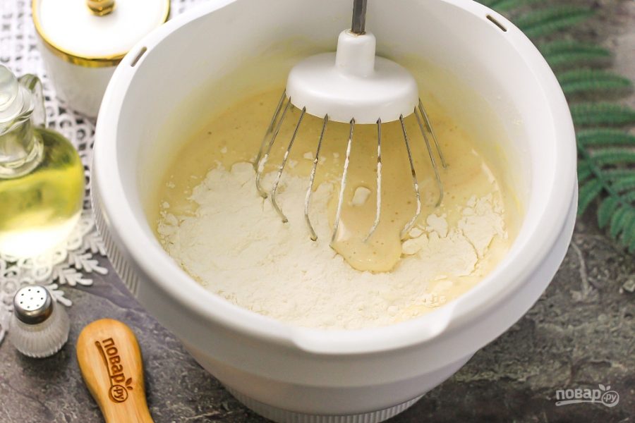 Всыпьте по частям пшеничную муку и разрыхлитель, вмешивая их в тесто.