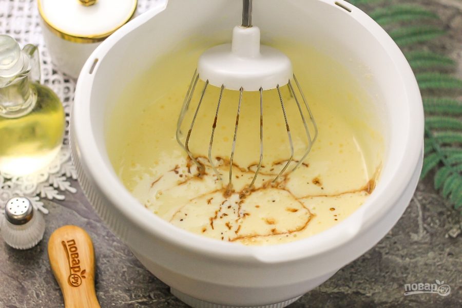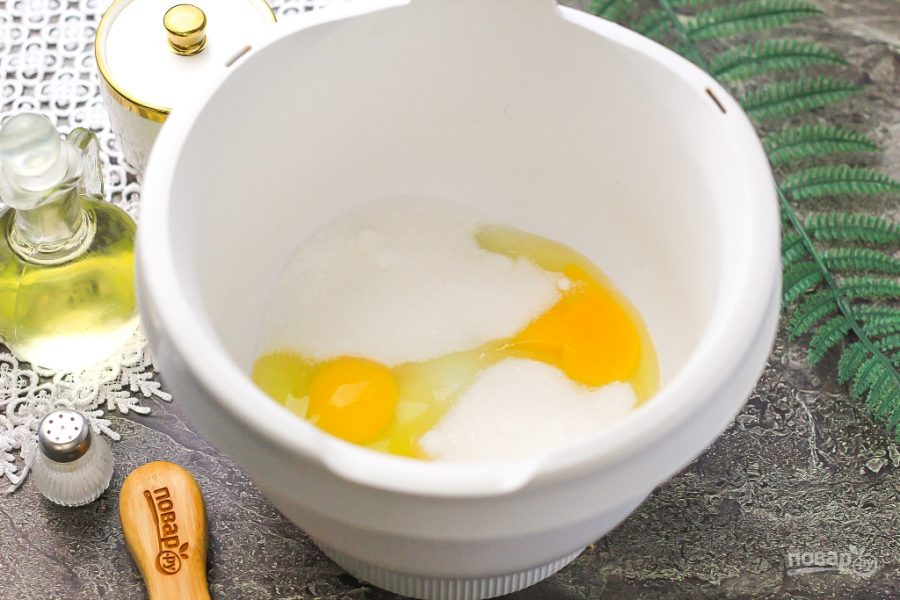 Вбейте куриные яйца в чашу миксера или кухонного комбайна, всыпьте соль, сахар и взбейте в течение 3-4 минут в пышную пену на самой высокой скорости техники.