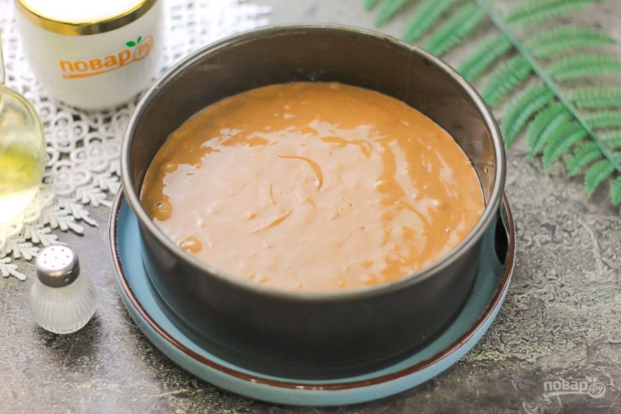Смажьте форму для выпекания растительным маслом, заходя и на бортики. Разогрейте духовку до 180 градусов. Выложите шоколадное тесто в форму и постучите несколько раз ей об рабочую поверхность, впуская из теста крупные пузырьки воздуха. Поместите форму в духовку на средний ярус.