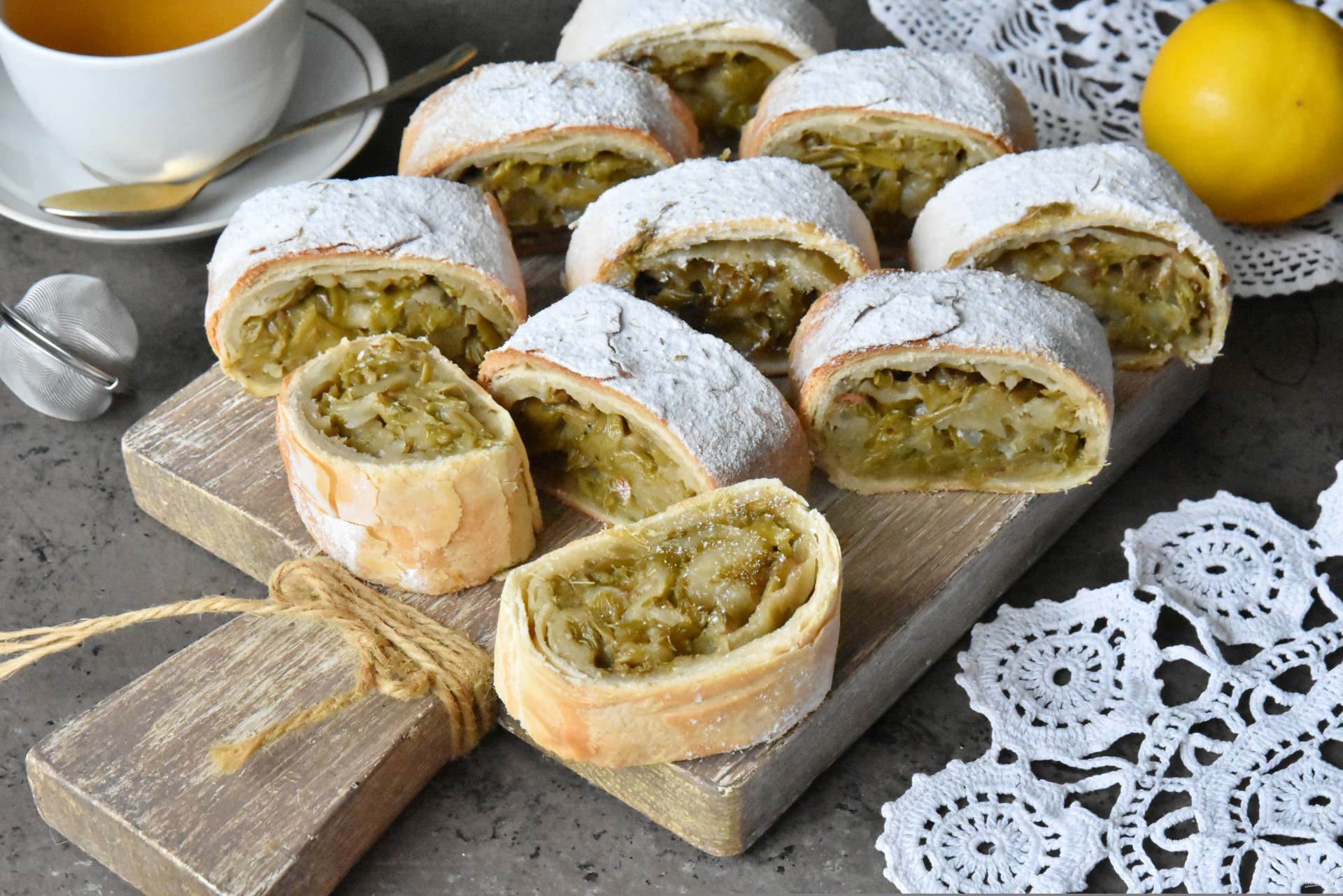 Готовому штруделю дайте полностью остыть. Перед подачей нарежьте его на кусочки и присыпьте сахарной пудрой.