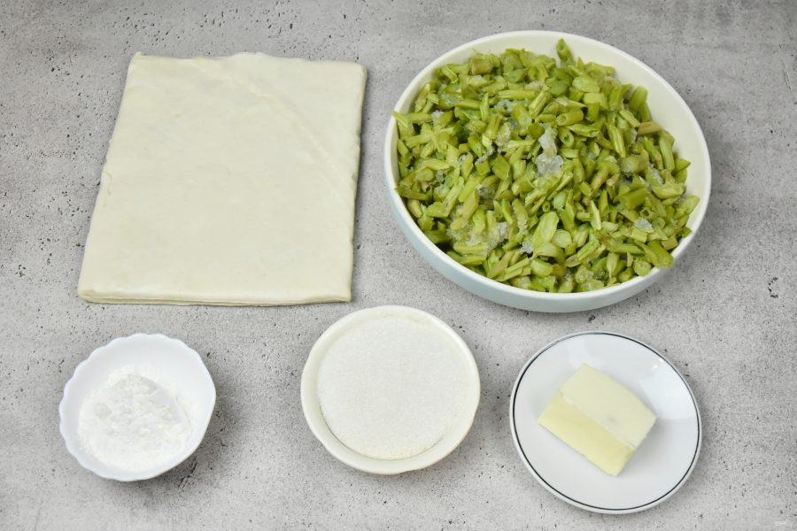 Для приготовления штруделя подготовьте продукты. Разморозьте бездрожжевое слоеное тесто и стебли кислицы предварительно обработанные, нарезанные и замороженные.