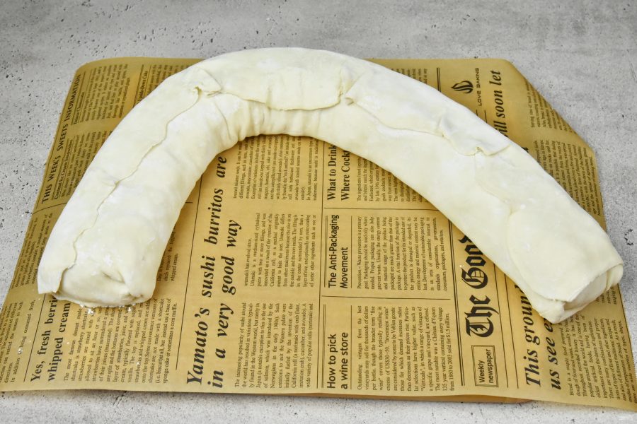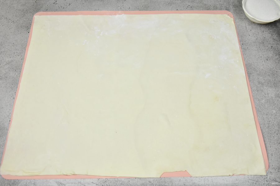 Размороженное тесто выложите на силиконовый коврик присыпанный небольшим количеством кукурузного крахмала. Раскатайте тесто скалкой в пласт 3-5 мм.