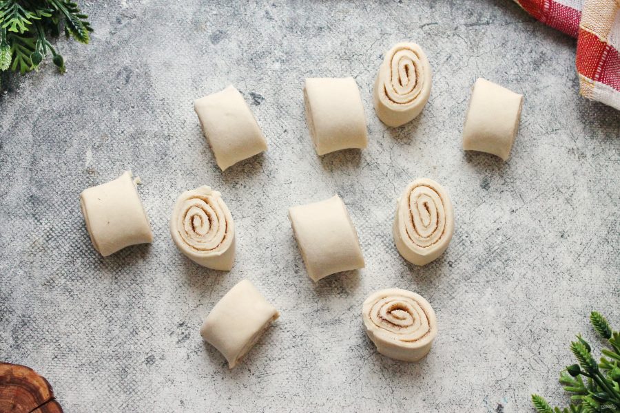 Форму для запекания застелите силиконизированным пергаментом или смажьте форму растительным маслом. Выложите кусочки рулета на небольшом расстоянии друг от друга срезом вверх. Форму накройте и оставьте в теплом месте для подъема.