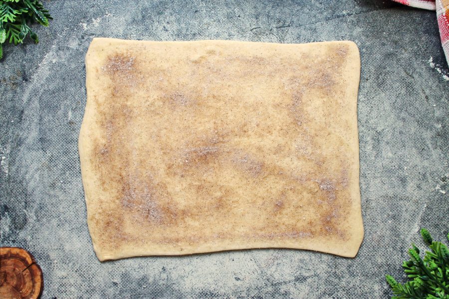 Слоеное дрожжевое тесто разморозьте. Рабочую поверхность стола посыпьте мукой и раскатайте немного тесто в прямоугольник. Смажьте всю поверхность растопленным сливочным маслом.