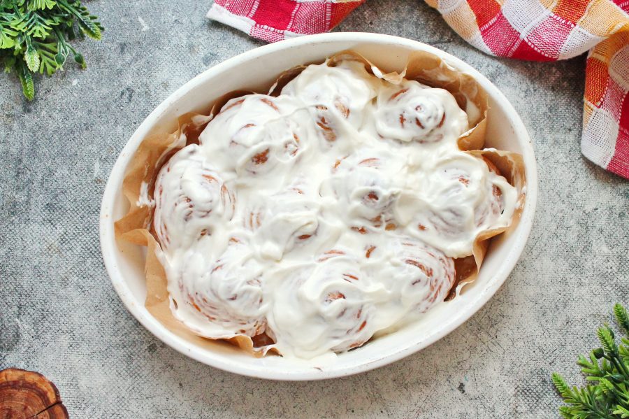 Готовые синабоны достаньте из духовки и сразу нанесите крем сверху ровным слоем. Дайте постоять несколько минут и подавайте на стол.