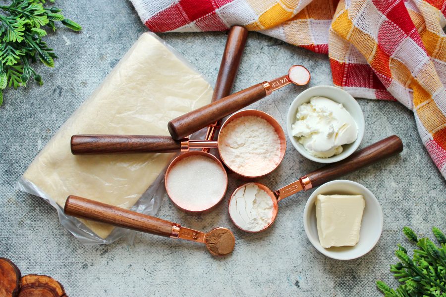 Подготовьте все необходимые ингредиенты для приготовления синабонов из слоеного теста. Сливочное масло растопите и остудите.