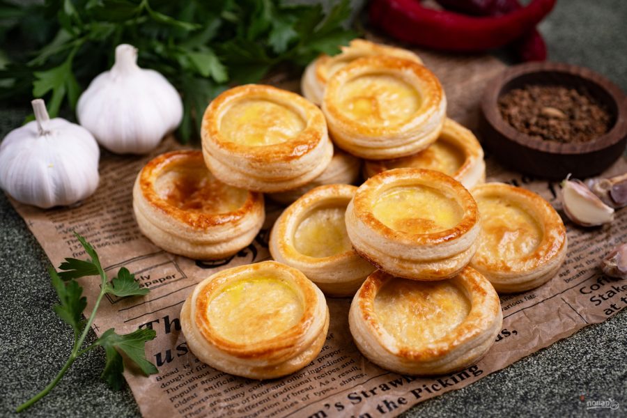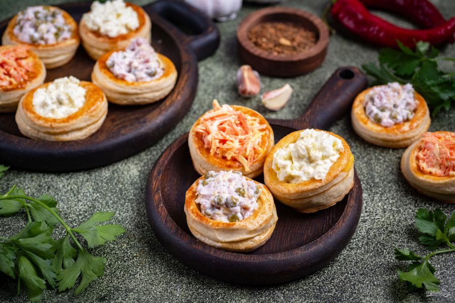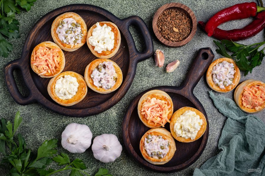 Тарталетки из слоеного теста по этому рецепту получаются очень красивые и невероятно аппетитные. Если вы заполните их начинками и украсите ими праздничный стол, то разберут их за секунды.