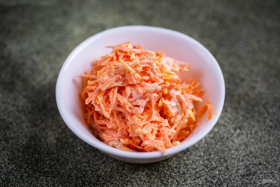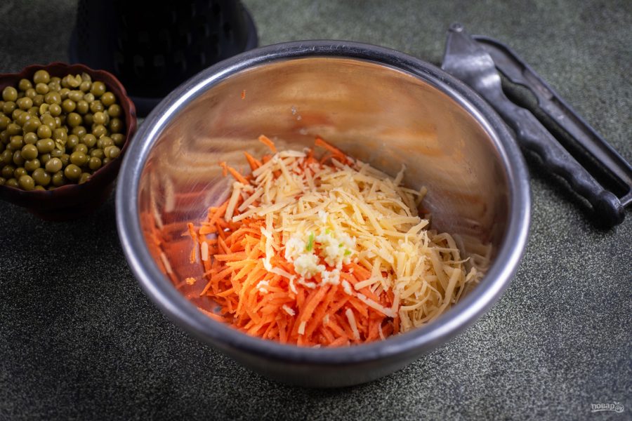 В просторную миску выложите натертую морковь, половину натертого сыра, к ним
