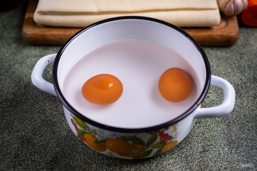 Приготовьте начинки для тарталеток. Сначала отварите яйца в кастрюле с водой до