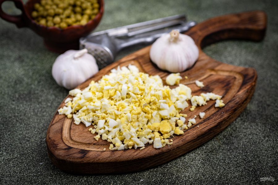 Нарезанные яйца выложите в просторную миску, выдавите к ним 2 очищенных зубчика