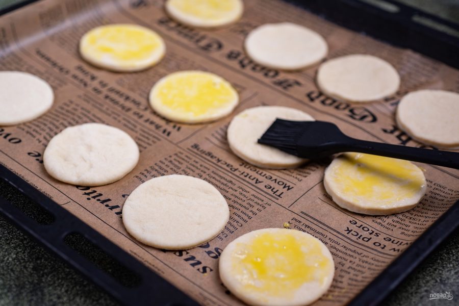 Выложите на противень, застеленный пергаментом для выпекания, все кружки и смажьте их смесью взболтанного куриного желтка и 2 ч.л. воды.