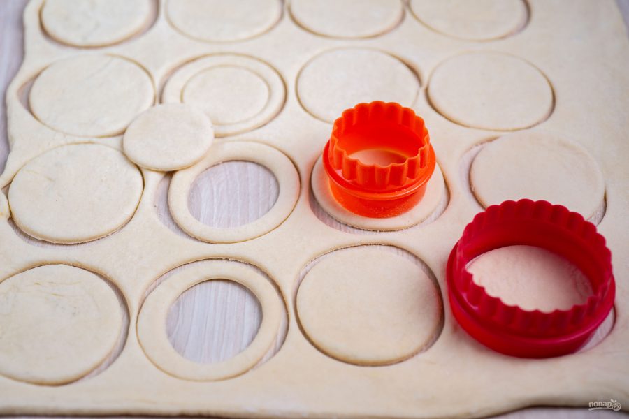 На рабочей поверхности раскатайте скалкой немного слоеное тесто. Используйте круглые