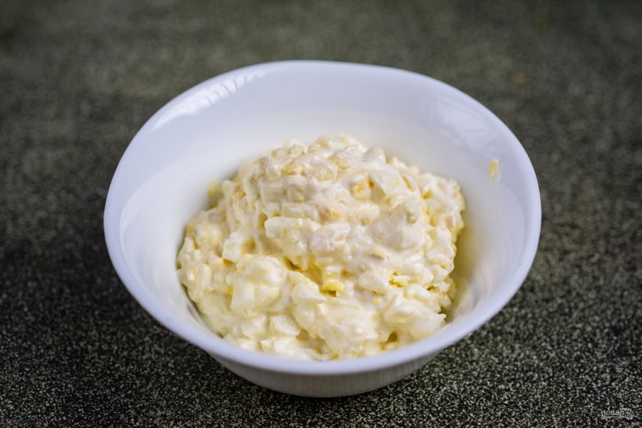 чеснока через чеснокодавилку, добавьте 2 ст.л. майонеза.