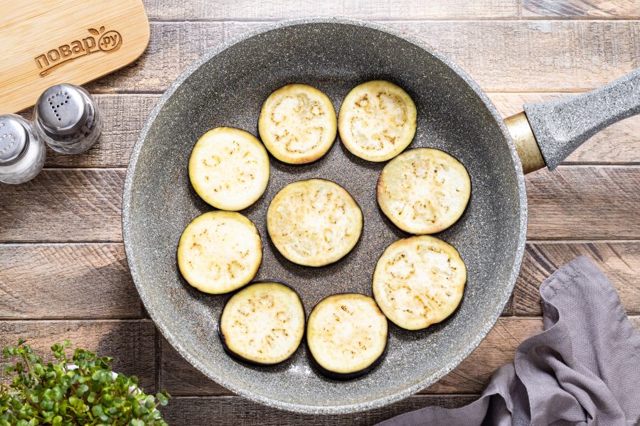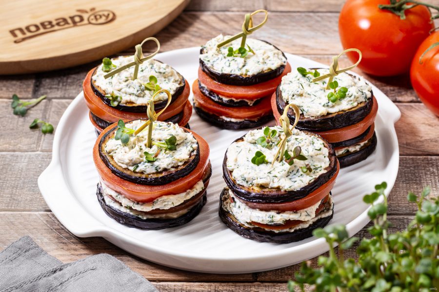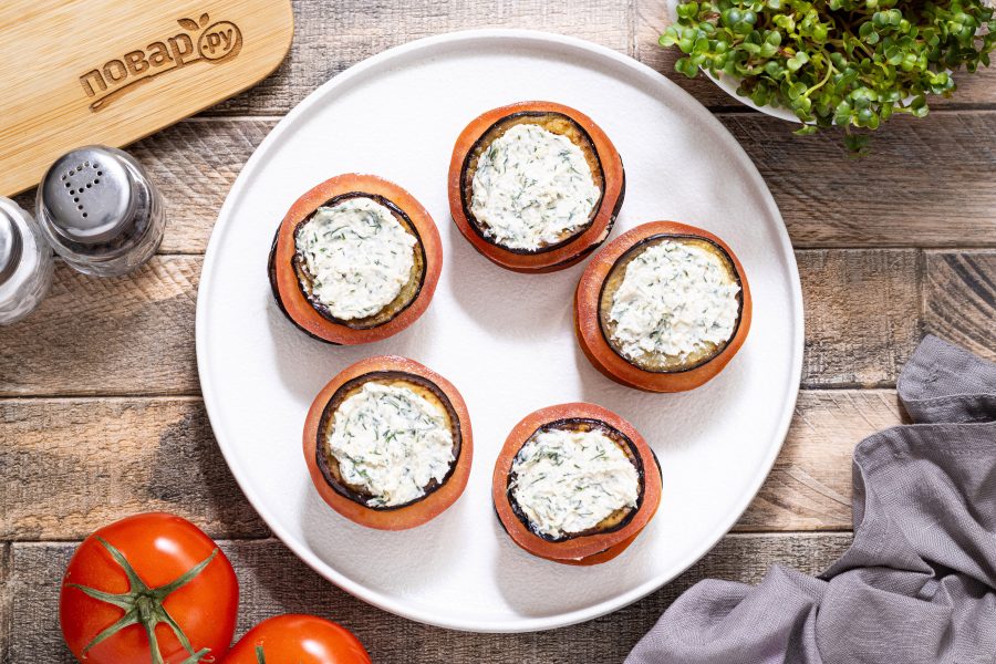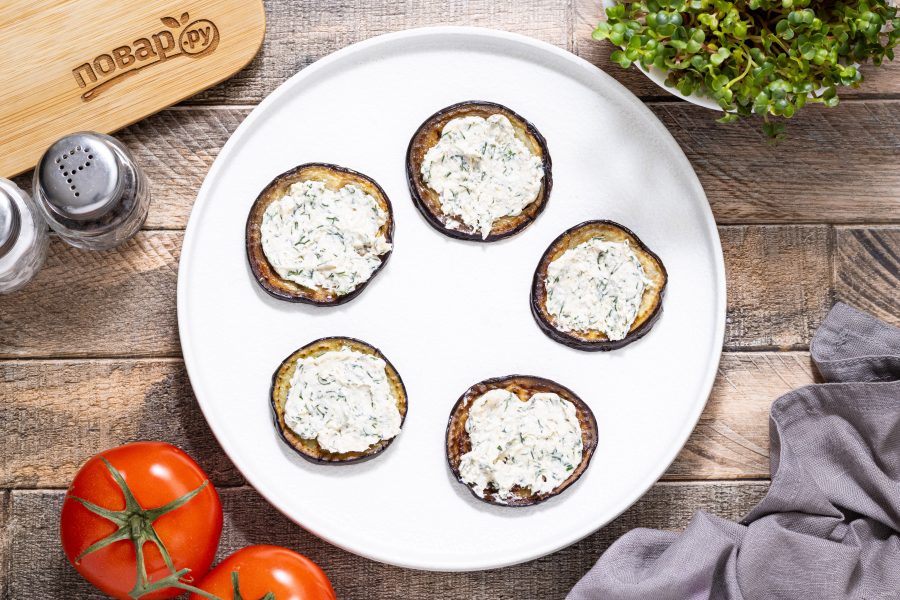 Поверх выложите новые кружочки баклажана, сверху творожный сыр и помидоры. Повторите еще 1 раз, чтобы верхний слой был из баклажана с творожным сыром.
