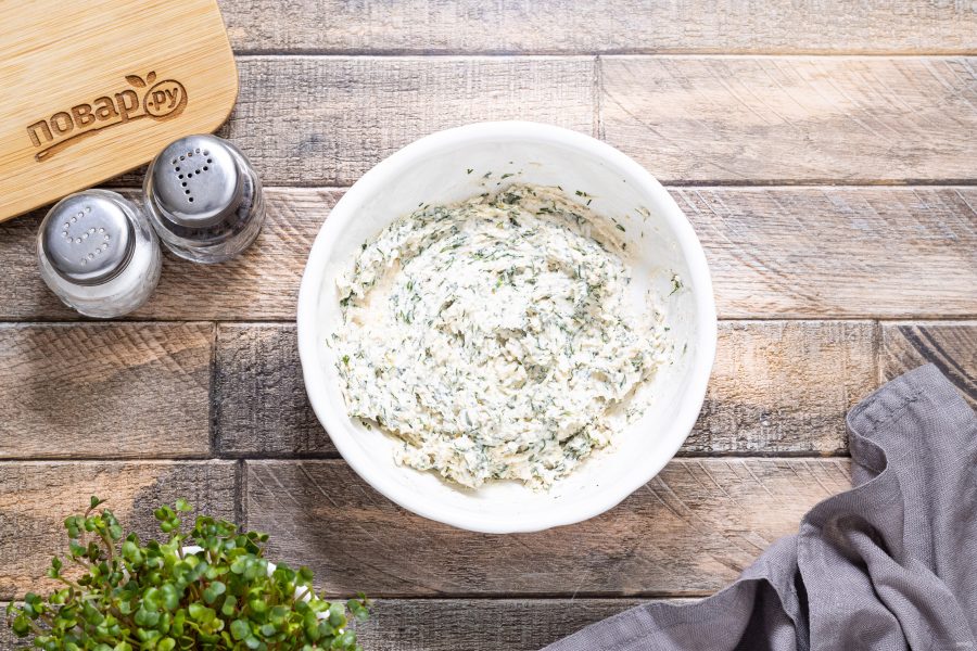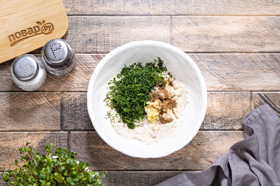 Укроп мелко порубите. Чеснок очистите и пропустите через пресс. Добавьте к творожному сыру. Посолите и поперчите по вкусу.