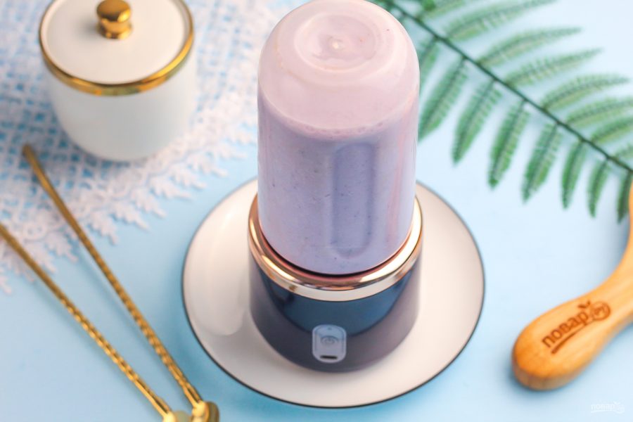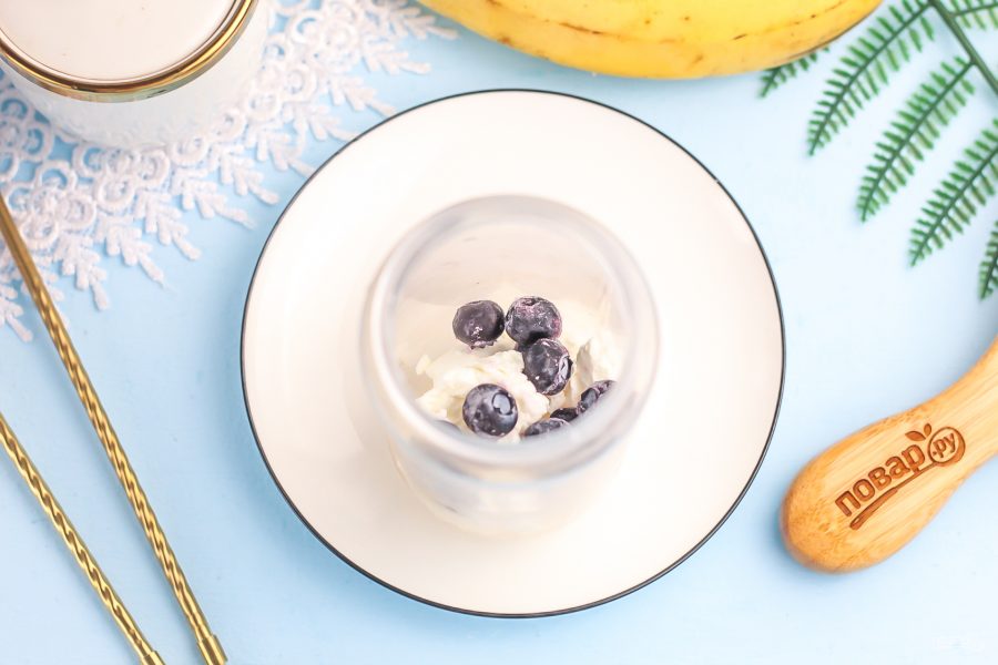 Творог любой жирности выложите в чашу блендера и добавьте замороженные ягоды голубики — их можно не размораживать.