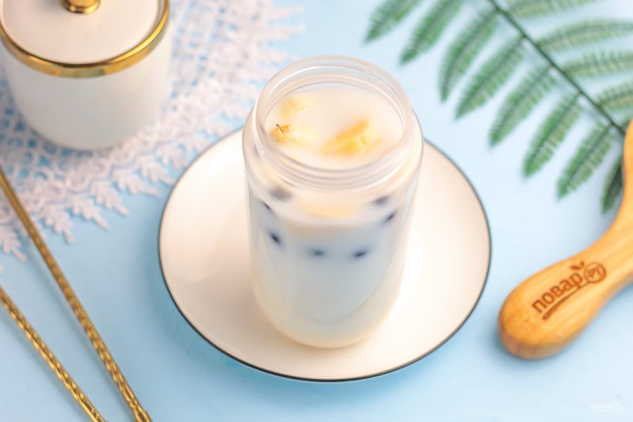Влейте холодное молоко любой жирности и любого сорта: коровье, козье, овсяное, кокосовое, соевое и т.д.
