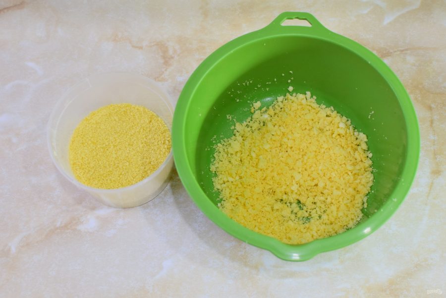Затем добавьте в панировку тертый сыр, соль и специи. Все смешайте.