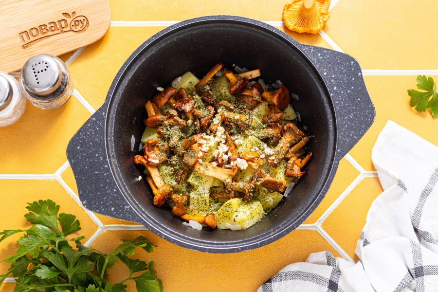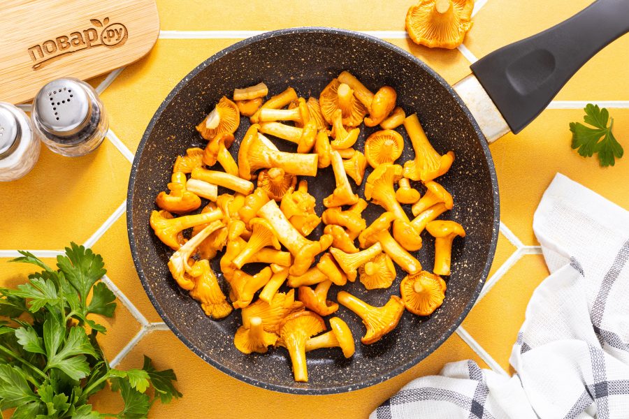 Хорошо разогрейте сковороду с растительным маслом на температуре выше среднего. Обжарьте лисички до румяного цвета и испарения лишней жидкости.