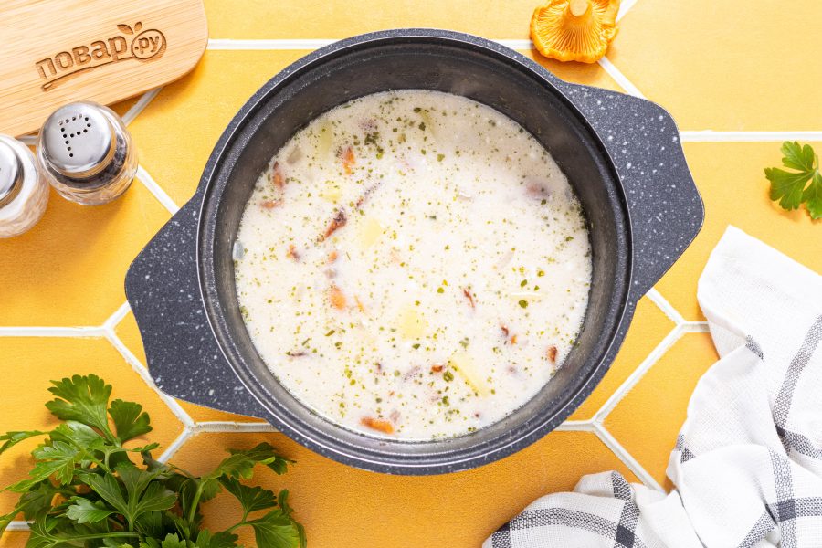 После влейте сливки, снова доведите до кипения и проварите еще 1-2 минуты. Затем суп можно подавать.