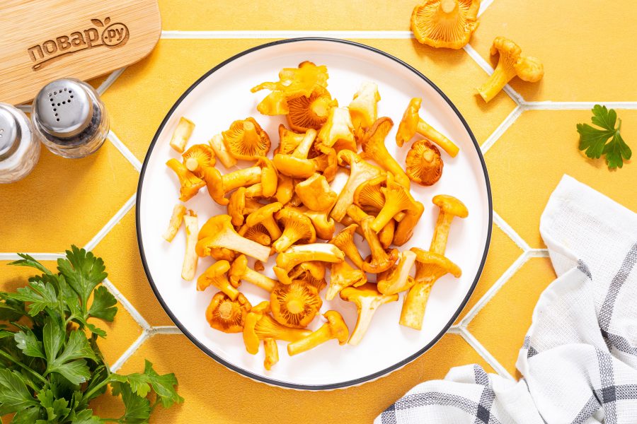 Лисички тщательно промойте, обсушите с помощью бумажных салфеток. Крупные грибы можно разрезать пополам, а маленькие оставить целыми.
