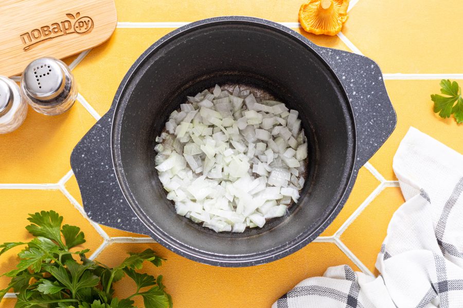 В кастрюлю с толстым дном влейте растительное масло, добавьте репчатый лук и жарьте до прозрачности.