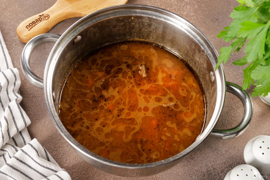 Влейте кипяток, количество воды зависит от желаемой густоты супа. Добавьте лавровый лист и варите 15-20 минут (до мягкости картофеля).