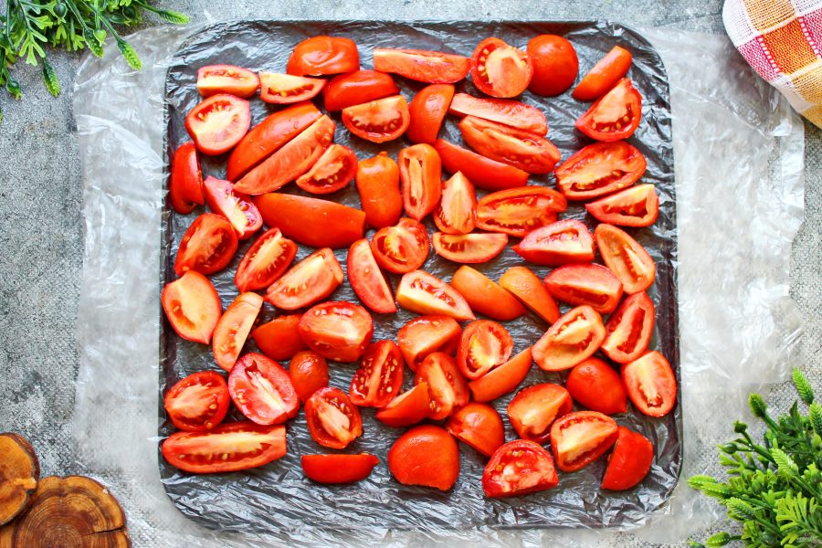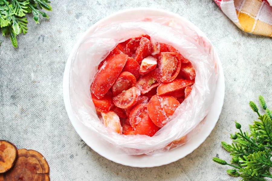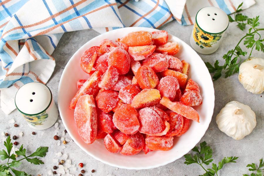 Поставьте подготовленные кусочки в морозильную камеру и оставьте в течение 10-12 часов, чтобы помидоры хорошо замерзли. Переложите готовые томаты в пакет, контейнер или запечатайте вакуумом. Уберите в морозильную камеру на хранение и вынимайте непосредственно перед приготовлением, так как повторной заморозки они не выдержат.
